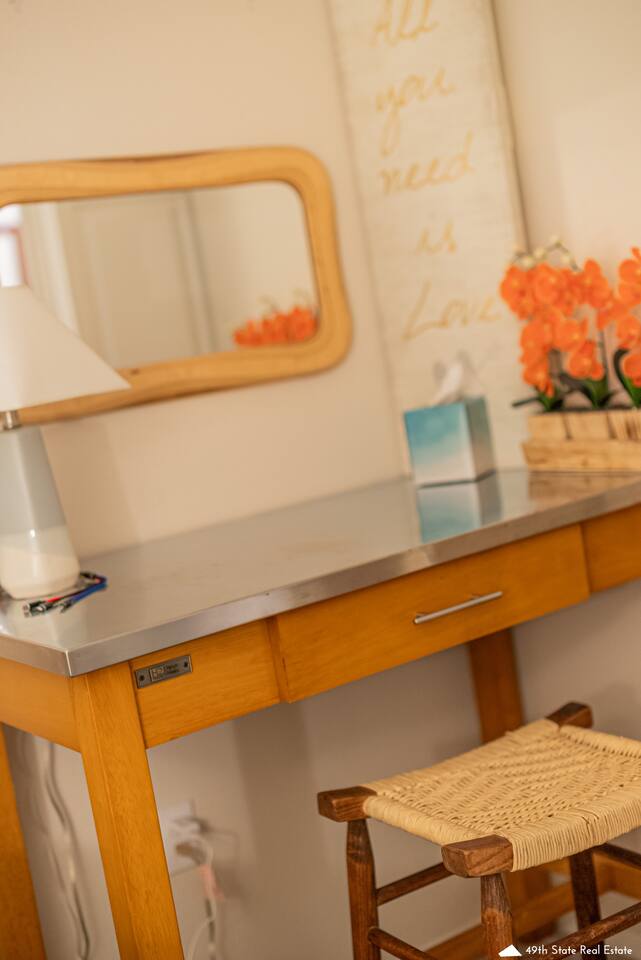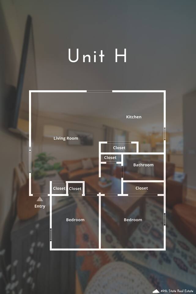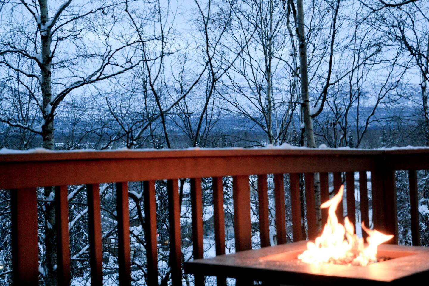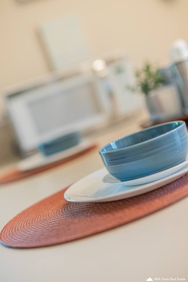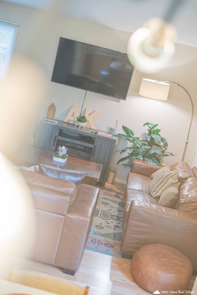 We appreciate the clean, simple, and natural elements of Scandinavian design, we hope you will too. Turn on the electric fireplace for some added ambiance or have a seat on your private balcony next to the gas fire table for the full experience. Unit H is our top unit and actually sits at ground-level. You will take one step onto the decking and one step down to enter your front door. This unit is very access-friendly to accommodate guests of all ages and abilities. Perfect for Military Travel Lodging, JBER, Travel Nurse, Alaska Vacation, Student Housing!